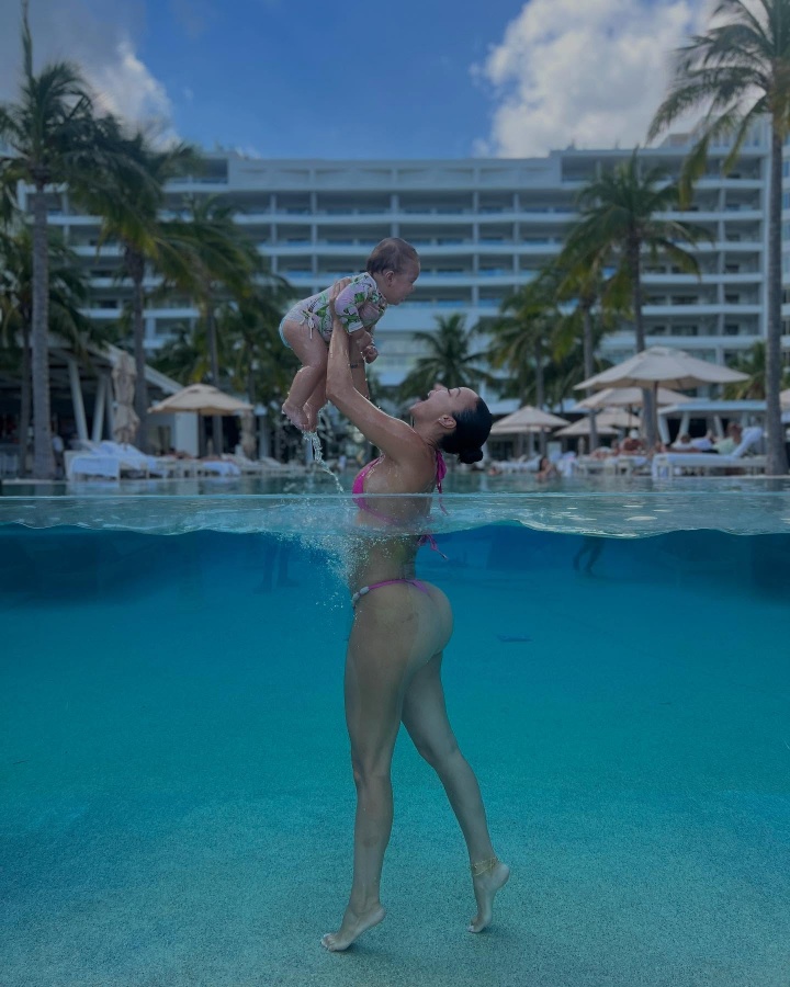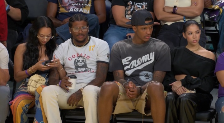场边,太阳球员杰伦-格林携40岁的女友Draya,与前队友小贾巴里-史密斯及其女友一同场边观战飞翼VS火花的比赛。